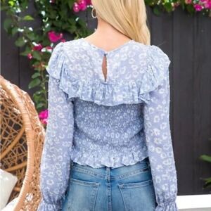 Beautiful blue and cream leopard print long sleeve smocked top with ruffles. 100% rayon.