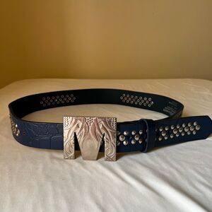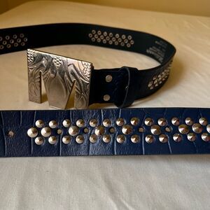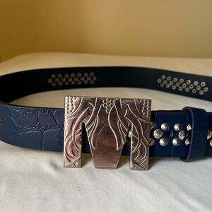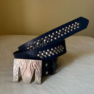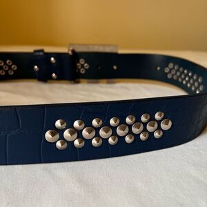 Blue Croc Embossed Studded Leather Belt Silver M Buckle Statement Y2K 40"