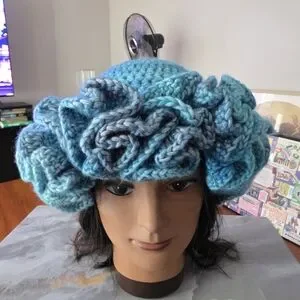 Stay stylish and warm with this blue crochet ruffle hat. Perfect for adding a pop of color to any outfit. This was handmade by me using 100% acrylic yarn