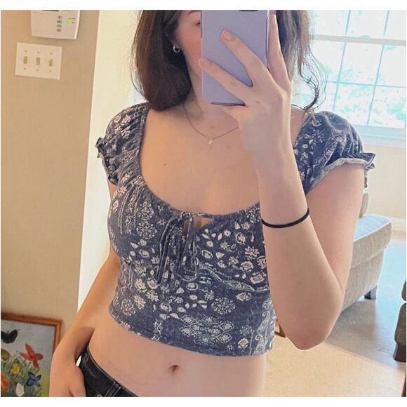 Blue Crop Top Women Floral Pattern Puff Sleeve Tee Size Medium