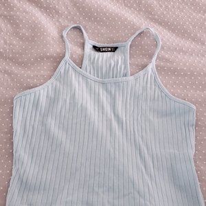 A small blue cropped tank from Shein, it is brand new and was never worn. ( 15 1/2 ) inches long