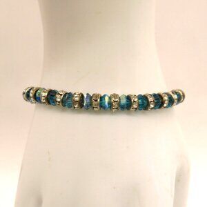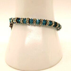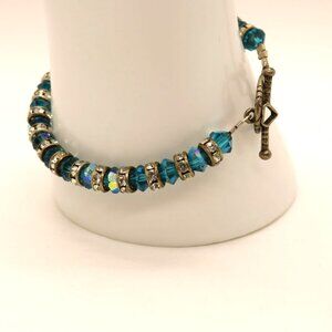 Eye-catching bracelet featuring shimmering blue crystal beads and sparkling rhinestone accents. Heart toggle clasp ensures secure and stylish wear.