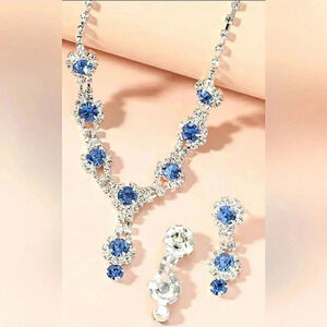 Absolutely Stunning New With Tags Box Blue Crystal Cubic Zirconia Events Cocktail Necklace Earring Set Christmas Holiday New Year Birthday Moblife Girlfriend Gift Wedding Fashion Statement Elegant Chic Alloy Metal Hypoallergenic 3 Piece Set