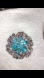 Restoration project of mine, small brooch with aqua marine colored flat top crystal stones that form a circular pattern in the center. Wear it as a flower in the spring, or as a snowflake in the winter.