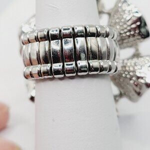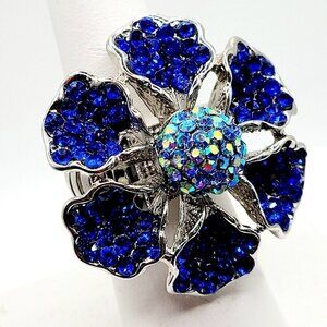 Blue Crystal Pave Set Flower Stretch Statement Ring Silver Tone LN Condition