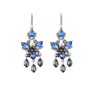 Blue Crystal Flower Silver Vintage Hook Dangle Statement Earrings