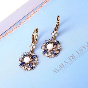 Blue Crystal Pearl Vintage Gold Leverback Statement Earrings