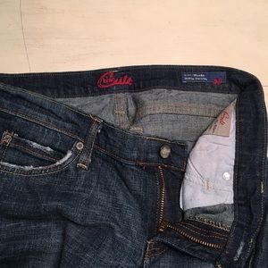 Size 28 Blue Cult jeans. Purple and gold embellished pockets! Gently worn, no rips or tears. 32" inseam. Midrise flare jeans.