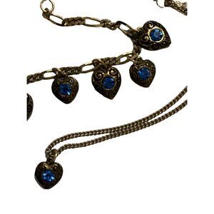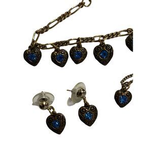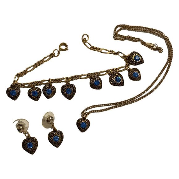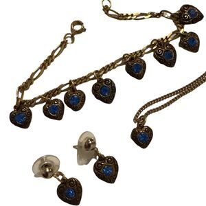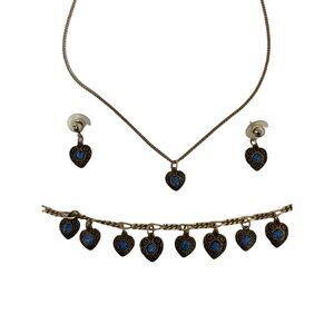 Darling bracelet, earrings and pendent jewelry set featuring multiple dangle blue stone hearts on antique gold hardware. Spring ring clasps. All in very good condition