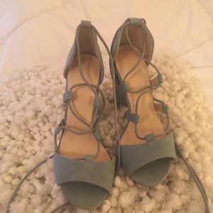 Worn once. Light denim ankle tie sandals with a 4 inch heel and embroidered rose detail along the heel. Peep toe style, perfect for dressing up or down!
