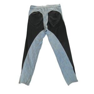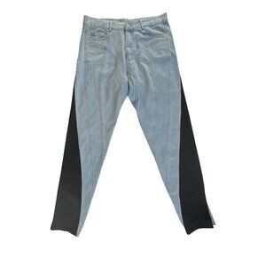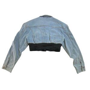 This unique two-piece set features a cropped denim jacket with black contrast panels and matching pants. The light wash denim is complemented by strategic black fabric inserts, creating a modern silhouette with retro inspiration.