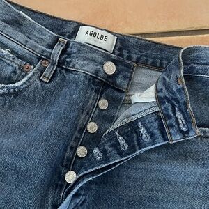 Blue Denim Distressed High Waisted Button Straight Leg Jeans - Agolde - Size 25