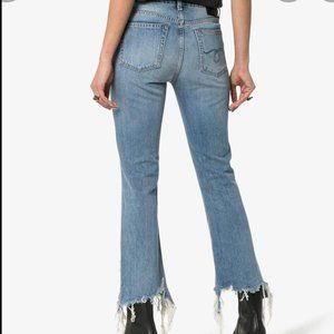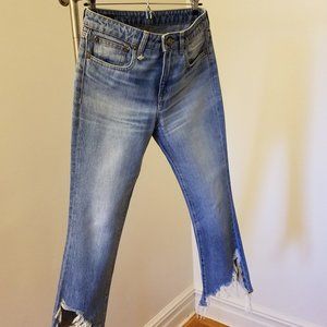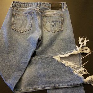 100% Denim, mid rise, size 25, distressed frayed bottom.