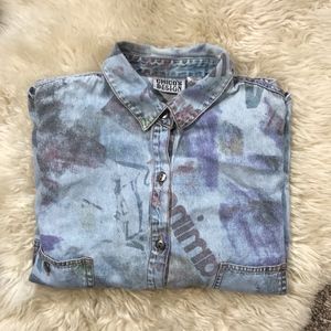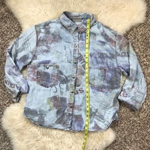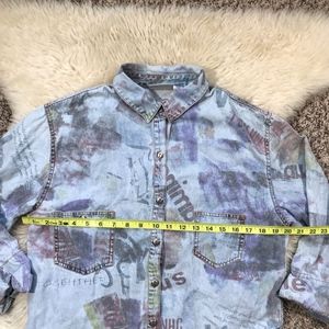 Blue Denim Distressed Look Button Up Chico's Sz 1. This item is gently pre-owned with love. For exact size see measurements. It is a Cotton blend. Bin: Q