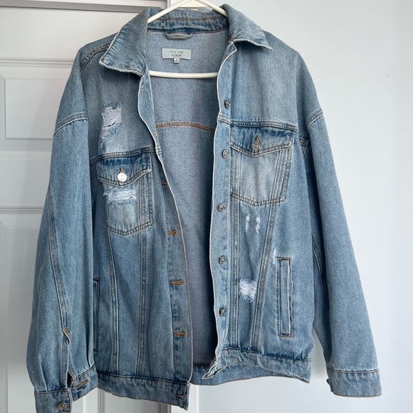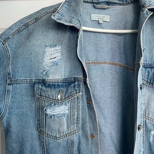 Stylish blue denim jacket with distressed details. Perfect for casual wear.