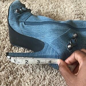 Stylish blue denim over-the-knee boots with pointed toes and decorative buttons.