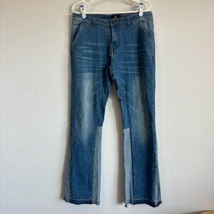 Blue Denim Patchwork Stretch Jeans Slim Fit Flared Pants