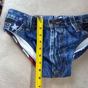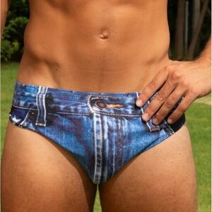 Dive into style with these blue denim print swim trunks. Perfect for a day at the beach or pool.