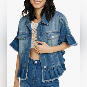 • Ruffle denim jacket perfectly blends the classic style we love in a jean jacket with updates like a cropped hemline and short sleeves trimmed with a frayed denim flounce. This medium wash has flap-pockets and silvery stud-buttons with a modern, boxy cut that is just right for so many beautiful seasons