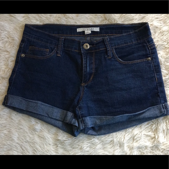 Blue Denim Shorts with front and back pockets. Cuffed hemline. Zipper front. Low rise with 30” waist.