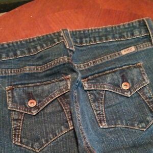 Stylish Misses blue denim jeans featuring a trendy frayed hem. Perfect for casual wear.