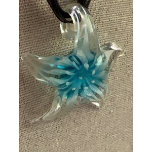 Blue Dichroic Star Fish Glass Pendant -- 18". In excellent pre-loved condition. Going on a cruise, or know someone who will be? This will make a great gift. You can put the pendant on another chain of your choice. Spirals of white and blue gleaming through bright, clear glass. Measurement: 2"x2".