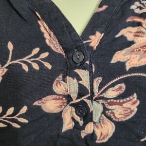 Navy blue with a pink floral print High low curved hem V neck with button detailing 100% viscose