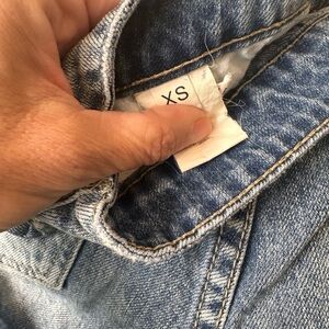 These blue jean shorts feature a heavily distressed design with large horizontal tears and frayed edges, giving them a casual, well-worn look. The cut-off hem adds to their laid-back style, making them perfect for relaxed outings.