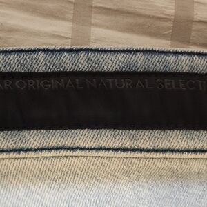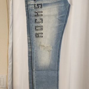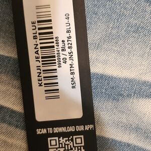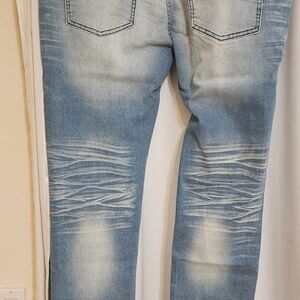 Stylish blue jeans featuring distressed details and bold lettering. Perfect for a casual look Slim fit jeans.