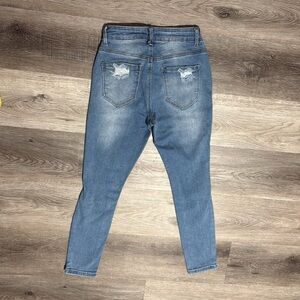 Stylish blue distressed jeans perfect for a casual look. Comfortable fit and trendy design.
