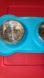 Blue double pet bowl with two silver dishes. Perfect for feeding pets.