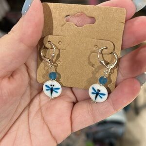 These pretty handmaid earrings feature a charming dragonfly design in blue and white. Perfect for adding a touch of whimsy to any outfit.
