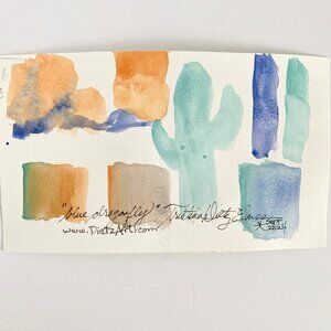 This exciting wall or desk art piece includes expressive handmade watercolor brush strokes and fun permanent pen accents. The colors include blue, aqua green and orange.
