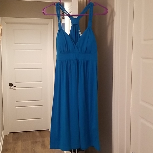 Blue dress with padding and cute braided strap detail. Second picture depicts accurate color. Hits me just above the knee at 5'11".
