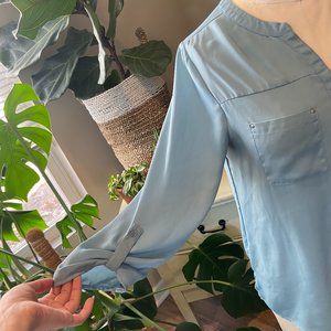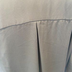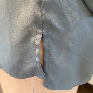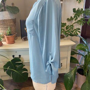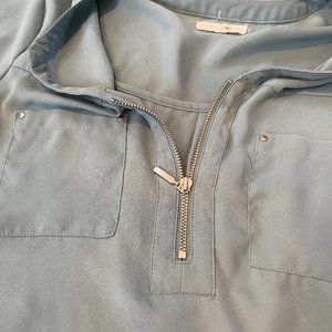 Lightweight dress shirt - looks great with jeans, dress pants, and leggings. 3/4 length sleeves. Front zipper unzips.