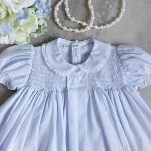 This Feltman Brothers Blue Smocked Heirloom Dress in size 3 months is Heavenly Sweet. The top of the bodice has an accordion design smocking with white embroidery details placed evenly throughout. A white scalloped embroidered border sits where the skirt portion gathers. Short puff sleeves has elastic gathers with a ruffle hem. The Peter Pan collar is trimmed in a delicate white French Lace. Two center pleats adorn the front of the dress and have 4 pearlized petite buttons creating a faux placket.. Upper button back. Size 3 months but will accommodate size 6 months (see measurements below for fit). Quality Heirloom garment. Brand New With Tags!! Unique item, difficult to find- no longer produced- GREAT FIND!!!