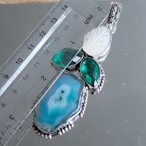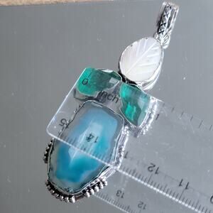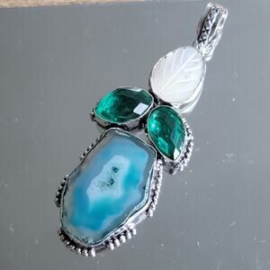 This handmade pendant showcases a stunning combination of blue druzy agate, a carved mother of pearl leaf, and two faceted green quartz stones. Set in sterling silver, this piece offers a unique, elegant design perfect for any jewelry collection.