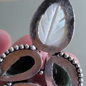 Gemstone Details: Features natural blue druzy agate, a delicately carved mother of pearl accent, and vibrant faceted green quartz stones.