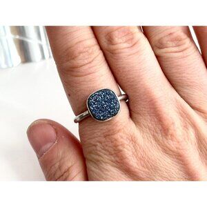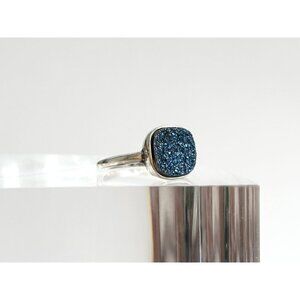 Vintage sterling silver blue druzy quartz bezel set ring. Druzy Quartz refers to a layer of minute quartz crystals that have crystallized on the surface of a quartz based mineral. Druzy Quartz has a sugar-like appearance. They are often found in the hollow cavity of Agate geodes. The stone is absolutely gorgeous, shines wonderfully in the sun. Checked and tested positive for sterling when checked. Very pretty piece.