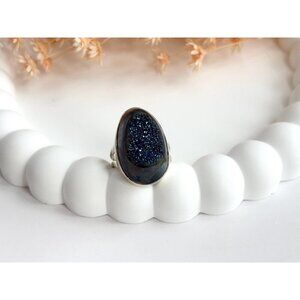 Vintage sterling silver blue druzy quartz bezel set ring. Druzy Quartz refers to a layer of minute quartz crystals that have crystallized on the surface of a quartz based mineral. Druzy Quartz has a sugar-like appearance. They are often found in the hollow cavity of Agate geodes. The stone is absolutely gorgeous, shines wonderfully in the sun. Checked and tested positive for sterling when checked. Very pretty piece.