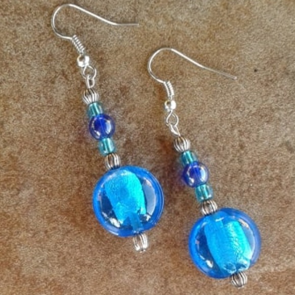 Blue lampwork glass beads lined in silver with assorted bead embellishment. All metal and glass beads.