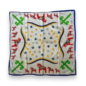 This vintage scarf is a must-have for any fashion-forward individual. With its unique pattern of horses and colors of white, green, and beige, it's sure to make a statement no matter how you choose to wear it. Measuring 26" x 26" and made of high-quality cotton, this square scarf is both comfortable and durable.