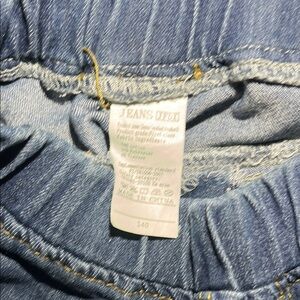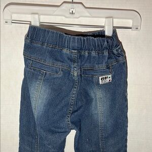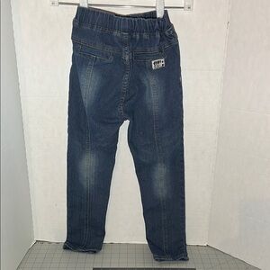 These blue jeans feature an elastic waistband for easy wear and a relaxed straight leg style. The denim showcases a classic indigo hue with subtle fading around the thighs and knees, complemented by rolled cuffs for a casual touch.