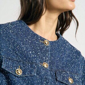 Blue Elegant Women's Collarless Button Front Long Sleeve Denim Jacket