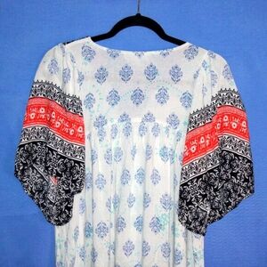 Embrace free-spirited style with this charming Blue Elephant tunic dress! Featuring intricate embroidered-look detailing around the neckline and a vibrant mix of folkloric prints in blue, red, and black on a white background, this flowy dress is perfect for bohemian aesthetics, summer festivals, or a casual, eclectic look.