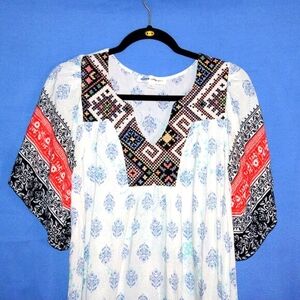 Style: Tunic dress, V-neck with embroidered-look trim, short sleeves, all-over folkloric print, relaxed fit