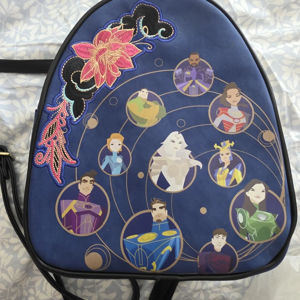 Bioworld Marvel Eternals Cast Convertible Floral Mini Backpack Stylish blue backpack with vibrant embroidery. Perfect for adding a pop of color to your outfit.