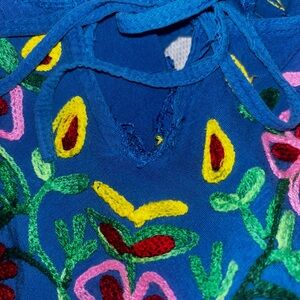 Blue boho-style tunic dress with colorful floral embroidery on the neckline and tie detail at the front. Features 3/4 sleeves and a loose, flowy fit. Can be worn as a dress or layered as a tunic. Some tearing in front if collar area