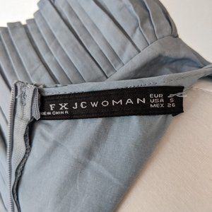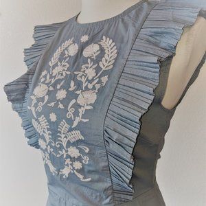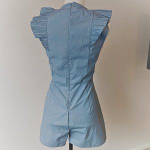 Lightweight sleeveless light blue romper with white embroidered flowers on the front by FX JC Woman.