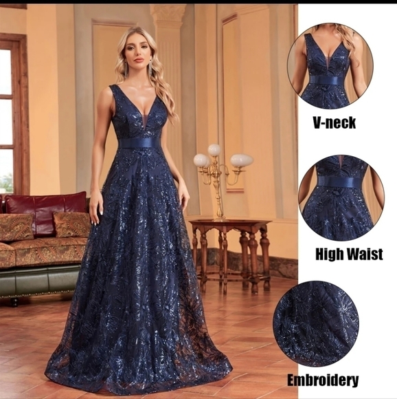 Blue, Embroidered, V Neck, Sleeveless, Tulle, Empire Waistline Long Maxi Gown for Special Events.